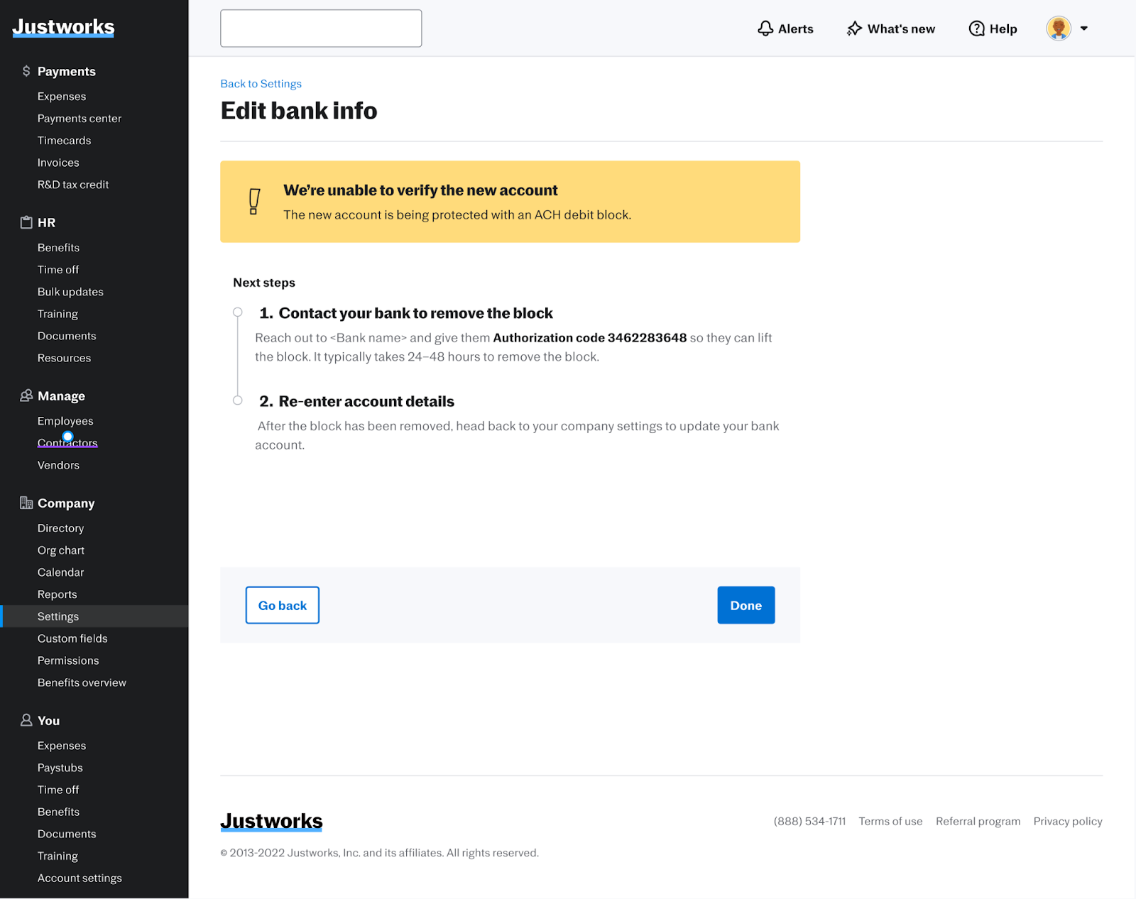 To prevent any impact to payroll, the option to update your company bank account will be blocked each day between 2pm ET to 6pm ET. Justworks will notify you during this time period and direct you to try back at a later time.